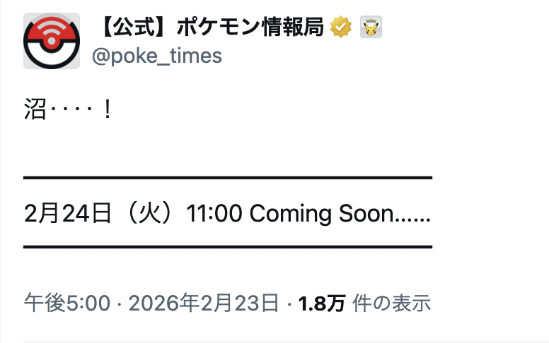 海外任天堂より「ぽこあポケモン」のプレイ動画が公開予定 2026.02.23 未分類 ykikichan ポケモン速報 謎のアナウンスが発表。「沼…!」の一言が意味するものとは? 2026.02.23 未分類 ykikichan ポケモン速報 【ポケモン30周年】全国5都市で屋外広告を展開!30周年ロゴアイコンがもらえるXキャンペーン開催中 2026.02.23 未分類 ykikichan ポケモン速報 【マイニンテンドーストア初公開】『Pokémon Champions』とは?HOME連携・対戦モード・Switch2動作表記まとめ 2026.02.20 未分類 ykikichan ポケモン速報 SwitchでFRLGが遊べる時代に|ファイアレッド・リーフグリーン配信決定 2026.02.20 未分類 ykikichan ポケモン速報 【ポケモンZA】サウンドトラックCDの詳細が公開!全148曲収録の決定版に 2026.02.17 未分類 ykikichan ポケモン速報 HIKAKINの「コロちゃお」付録カードが大会で結果を出す時代に 2026.01.30 未分類 ykikichan ポケモン速報 【プロモカードパック第3弾】新カード内容が判明!2月配布スタート 2026.01.29 未分類 ykikichan ポケモン速報 【ポケモン30周年】ピカチュウに続き“コイキング”ロゴが初公開!次に来るのは…? 2026.01.12 未分類 ykikichan ポケモン速報 12月10日配信「M次元ラッシュ」を最初から楽しむために──本編クリアは必須! 2025.12.09 未分類 ykikichan ポケモン速報 もっと見る